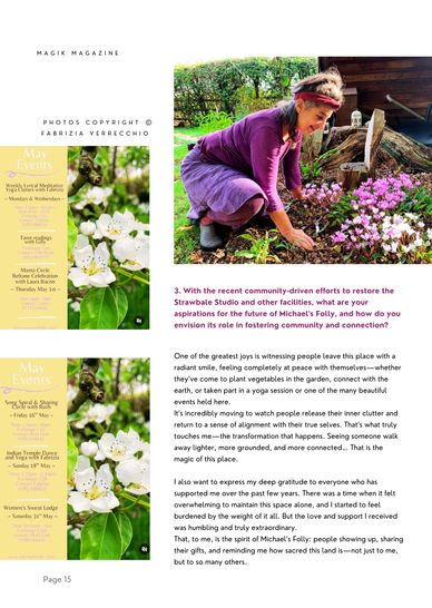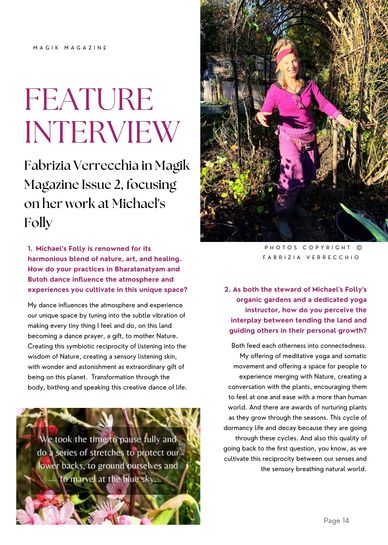 Fabrizia is a Dance (Bharatanatyam and Butoh) & Yoga Teacher, and Performer. She brings the therapeutic and holistic qualities of Dance and Yoga to people of all abilities. Fabrizia is also an organic gardener, and has tended the garden at Michael's Folly for decades.